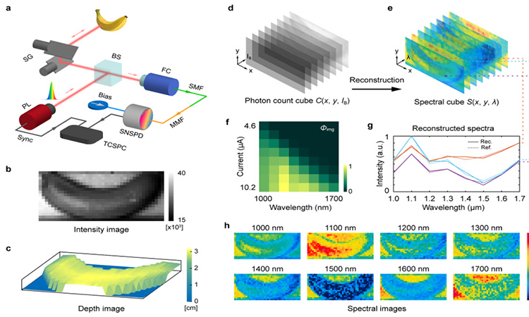 南京大学吴培亨院士团队首次在两者的结合上取得突破,他们利用超导纳米线单光子探测器固有的非线性光谱调制特性,结合计算光谱仪方法,实现了单探测器光谱仪(single-detector spectrometer, SDS)。这是一种最简化的光谱仪,摆脱了对光学分光器件的需求,通过编程探测器测量过程并结合计算重构算法,就能够对入射光谱进行分辨。实验演示了从660nm至1900nm的宽带测量能力,并在通信波段实现了优于10nm的光谱分辨率。同时,该团队还将激光雷达同单探测器光谱仪结合,演示了多光谱激光雷达功能。