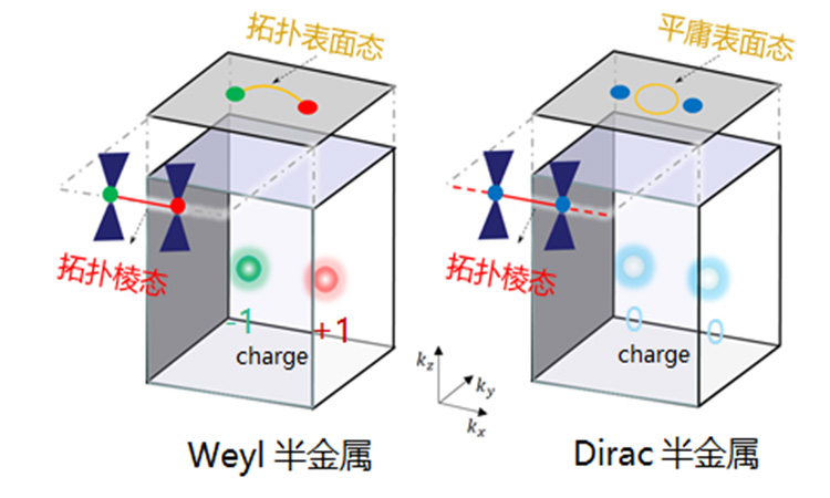 图1. Weyl半金属与Dirac半金属拓扑性质比较。