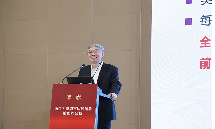 吕建以同心协力,雄创一流作工作报告。他指出,2021年,南京大学学科生态体系不断优化,人才队伍建设持续加强,人才培养改革成果丰硕,科学研究成绩喜人,办学新格局持续拓展,双一流建设取得显著成效。各位校董为我校人才引进、校区建设、政产学研合作、治理管理等事业提供了大力支持。吕建强调,即将到来的120周年校庆是南京大学谋划新篇章、构建新格局、开创新伟业的全新起点,希望各位校董一如既往关注支持南京大学的建设发展,与全体南大人共襄盛举。